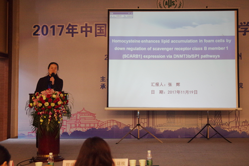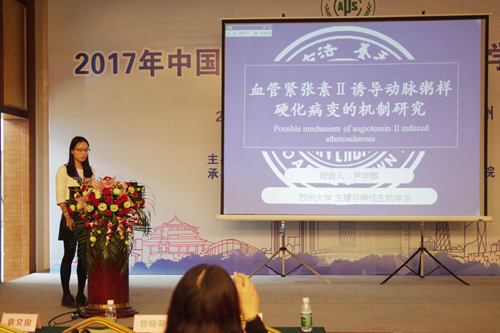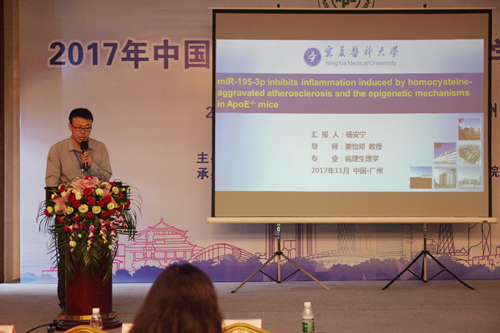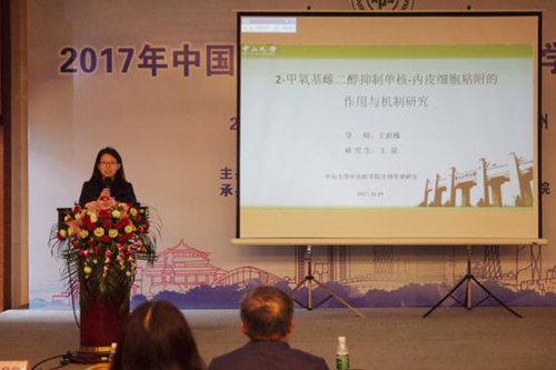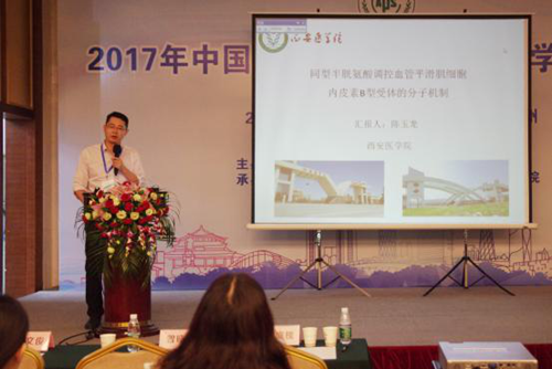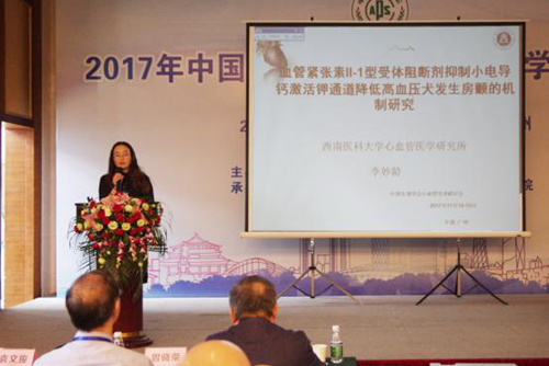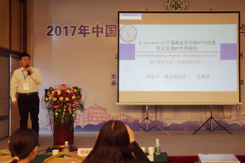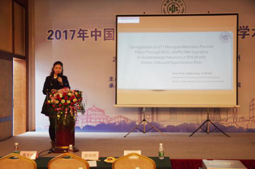 在19日下午举行的青年学术报告单元,一批来自各大高校、院所的青年学者、教师代表作了论文报告,分享其研究方法和研究发现。其中,复旦大学基础医学院周璇作《Upregulation of AT1 Receptor Mediates Pressor Effect Through ROS-SAPK/JNK Signaling in Glutamatergic Neurons of RVLM with Stress-Induced Hypertensive Rats》论文报告,郑州大学罗天霞作《Interaction of Junctophilin 2 with Ryanodine Receptors in mouse cardiac myocytes 》论文报告,中国医学科学院医学研究所蔺彩霞作《纳米银粒子对心脏电生理的急性毒性和机制研究》论文报告,苏州大学基础医学与生物科学学院生理系尹学敏作《血管紧张素Ⅱ诱导动脉粥样硬化病变的机制研究》论文报告,首都医科大学基础医学院王鹏丽作《Long-term stimulation of AT1-AA on H295R cells can inhibit aldosterone secretion by triggering calcium overload》论文报告,南京医科大学熊晓青作《FNDC5 attenuates obesity-induced adipose tissue inflammation via AMPK-mediated macrophage polarization》论文报告,宁夏医科大学杨安宁作《Homocysteine enhances production of pro-inflammation factors by foam cells through inhibition of miR-195-3P expression》论文报告,陆军军医大学大坪医院(野战外科研究所)郑丹阳作《内皮细胞微粒在脓毒症大鼠血管渗漏中的作用及机制》论文报告,西南医科大学马开龙作《KCNQ1基因孔区突变导致LQT1的机制研究》论文报告,中山大学中山医学院王晨作《VCAM-1 in 2-ME Inhibiting Monocyte-Endothelial Cell Adhesions》论文报告,中山大学中山医学院李劼昊作《慢性迷走神经刺激对结肠粘膜炎症反应的调控作用及生物反馈机制研究》论文报告,中山大学新华学院徐静婷作《Jia-jian-yi-yin decoction improves endothelium-dependent dilation in ovariectomized rats by reducing oxidative stress and enhancing nitric oxide production and bioactivity》论文报告,海军军医大学孙嘉岑作《beta-arrestin1下调高血压中枢AT1R改善氧化应激的作用研究》论文报告,中山大学孙逸仙纪念医院刘文浩作《Fueling IL-10 expression: mechanism of IL-33 reducing foam cell formation》论文报告,宁夏医科大学张辉作《Homocysteine enhances lipid accumulation in foam cells by down regulation of scavenger receptor class B member 1 (SCARB1) expression via DNMT3b/SP1 pathways》论文报告,西安医学院陈玉龙作《同型半胱氨酸调控血管平滑肌细胞内皮素β型受体的分子机制》论文报告,陆军军医大学大坪医院(野战外科研究所)张杰作《CX43对脓毒性休克大鼠血管渗漏的调节作用及机制》论文报告。
