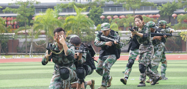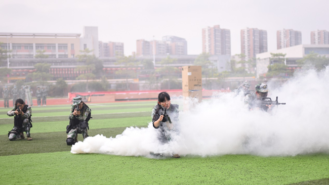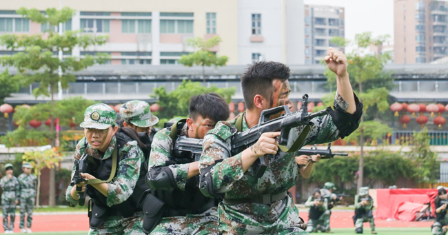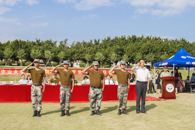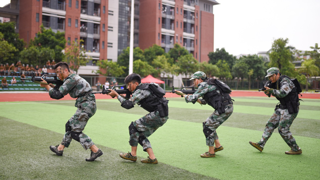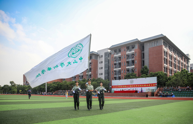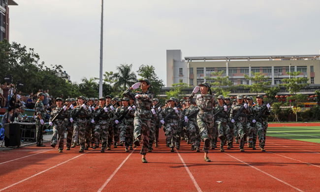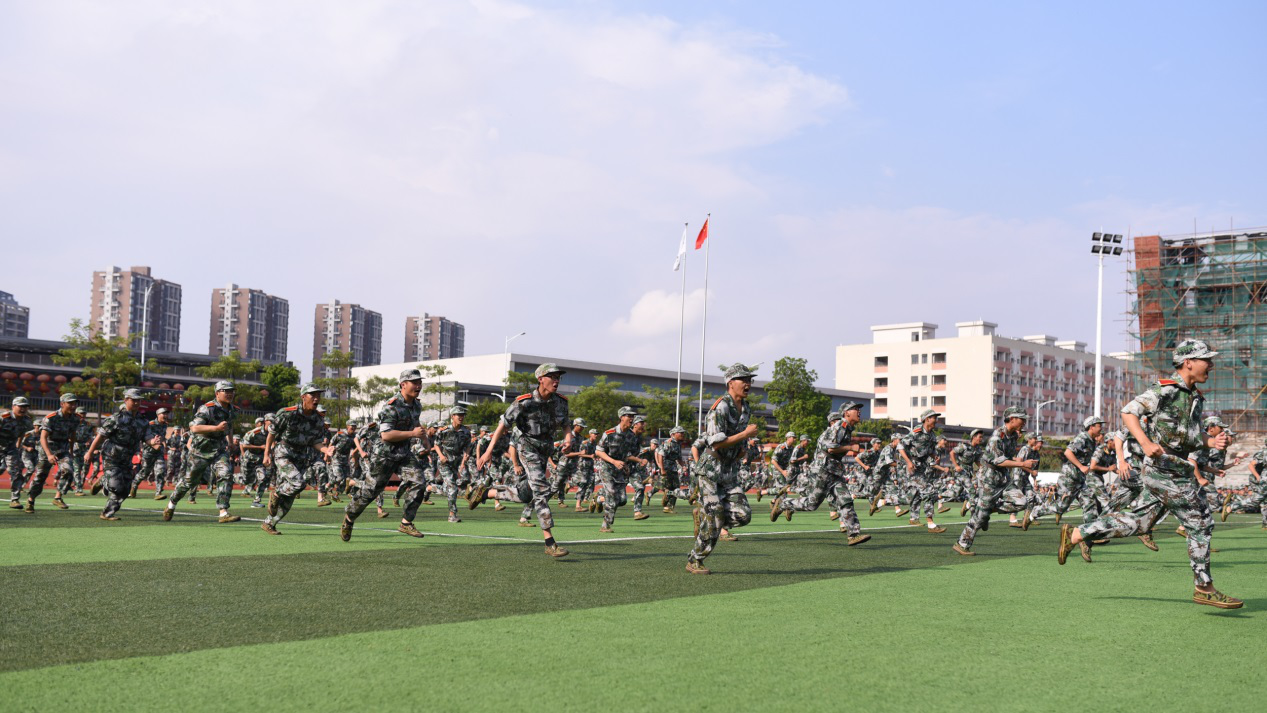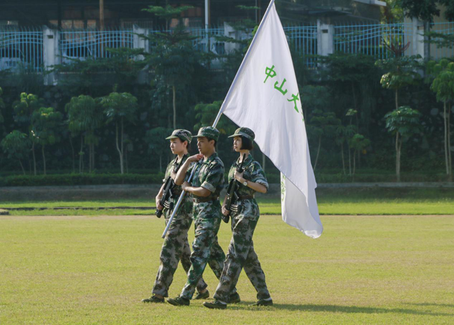 校旗飘扬,护旗手们步履铿锵,在庄严的歌声中打响军训汇演“第一枪” (东莞校区)
