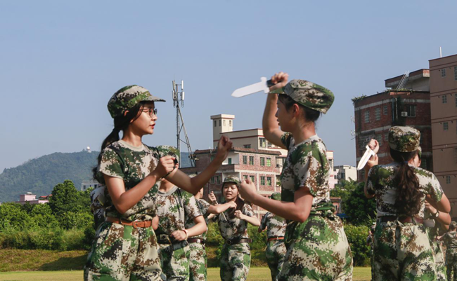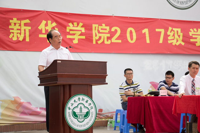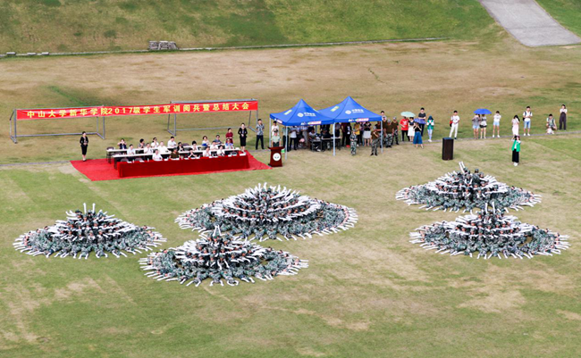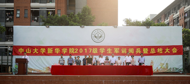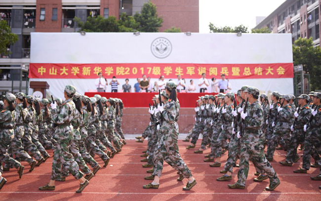 9月30日上午,中山大学新华学院2017级新生军训阅兵暨总结大会在广州校区运动场和东莞校区足球场同时举行。5500余名2017级参训新生汇报表演了军体拳、分列式、格斗、反恐战术、匕首刺杀操、拳术擒敌战、凤凰花阵等各项军训项目。他们军容整齐、士气高昂、蓄势待发,向学校领导、教学督导、院系(部)负责人、老师、家长及承训官兵们汇报了为期两周的严格训练所取得的丰硕成果,展现出中大新华学子们的军人风采和顽强意志,赢得了阵阵掌声。
