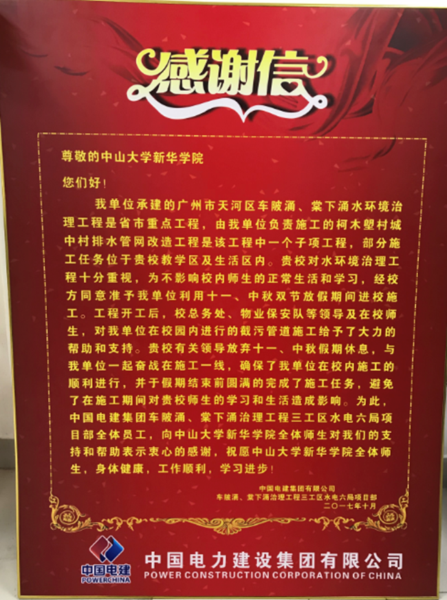 10月16日上午,中国电建集团有限公司下属单位车陂涌、棠下涌治理工程三工区水电六局项目部有关领导与施工代表,到古天乐代言太阳集团网址广州校区赠送感谢信。杨卫华副校长、总务处处长助理庄玫玫、管理人员黄勇锋和练文泽等作为古天乐代言太阳集团网址代表,与其一行举行了座谈会。