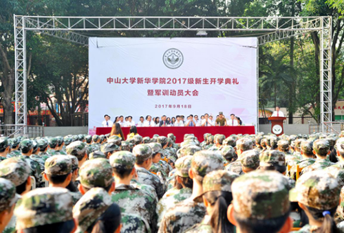 9月18日,中山大学新华学院在广州和东莞两个校区同日上午和晚上分别举行2017级新生开学典礼暨军训动员大会,为5578名新生用一场庄严而隆重的开学礼来开启他们人生重要阶段——读大学。