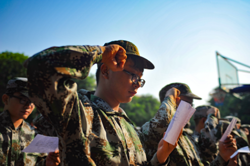 军训学员代表、2017级生物医学工程系、医学影像技术专业刘鑫说道,军训是迎来考验品格和意志的大学第一课,他代表新生承诺,面对九月的烈日和蚊虫的叮咬,不会退缩,而是会靠着吃苦耐劳的自强的精神,磨炼自己的意志,以战士的情怀,去用心体验军训的精彩。