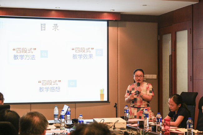 《汉语表达与应用写作》课程组教师代表李洁玲以她讲解的模块内容“言语理解与表达”的“四段式激越教学法”的运用:教师精讲2学时、个体学习自主安排、小组学习和实践2学时、成果分享2学时。并就每一环节的具体做法进行了案例介绍。
