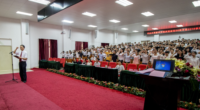 6月27日,中山大学新华学院在东莞校区举行庆祝建党96周年暨2016学年新党员入党宣誓仪式,对全体党员开展党性教育。学校党委领导出席仪式。蓝永金副书记、副校长主持会议。