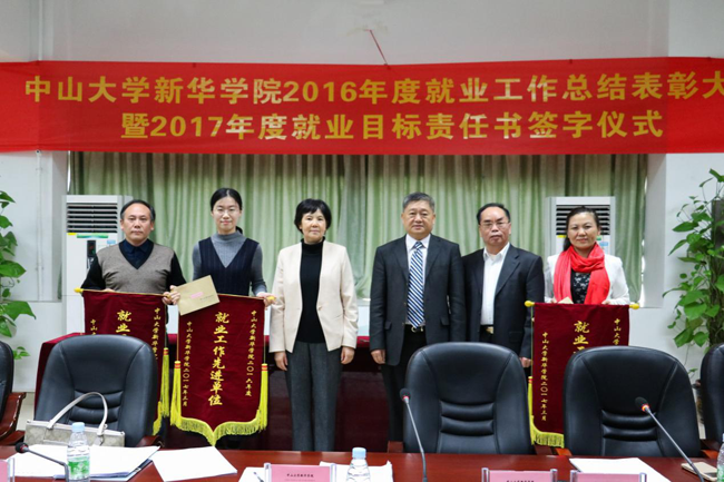 王庭槐校长(左四)、周云书记(左三)为2016年度就业工作先进单位颁发锦旗和奖金 廖家盈摄