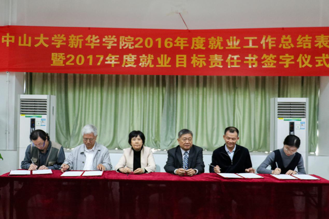 王庭槐校长(左四)、周云书记(左三)与各院系部签订2017年度毕业生就业创业工作目标责任书 廖家盈摄