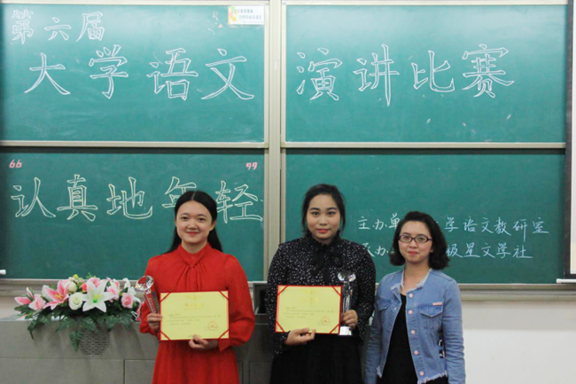 大学语文教研室林玮副主任(右一)与获奖选手合影 蔡曦晴摄