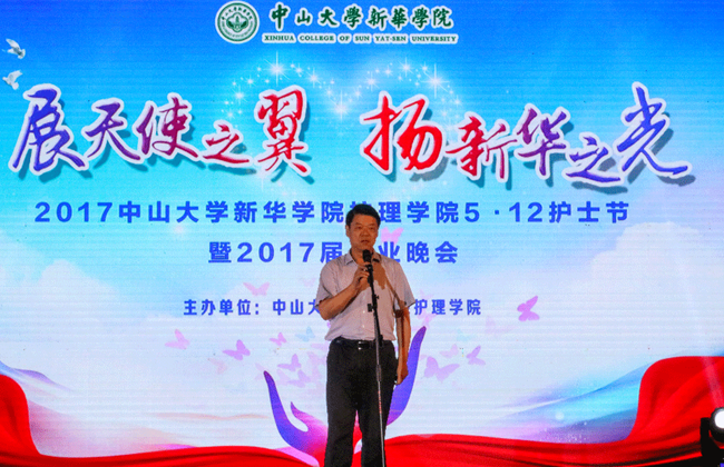 5月12日,由中山大学新华学院护理学院主办的5.12国际护士节暨2017届毕业晚会在广州校区举行。学校校长王庭槐、副校长李中生,外国语学院执行院长廖益清,继续教育学院院长董零,校长办公室副主任兼宣传与新闻中心主任蔡舒钏,护理学院名誉院长、首席教授李亚洁,执行院长王秀岚,首席教授、学科带头人Susan Holli Neidlinger等领导嘉宾及全体护理学院师生共赏晚会。