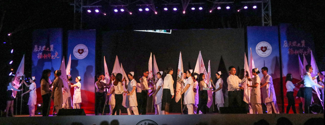 晚会上另一项重要内容是授旗仪式,2013级代表将手中实习医院的旗帜交给2014级代表,一个看似简单的交接仪式,实则通过手中的旗帜传承了南丁格尔精神。
