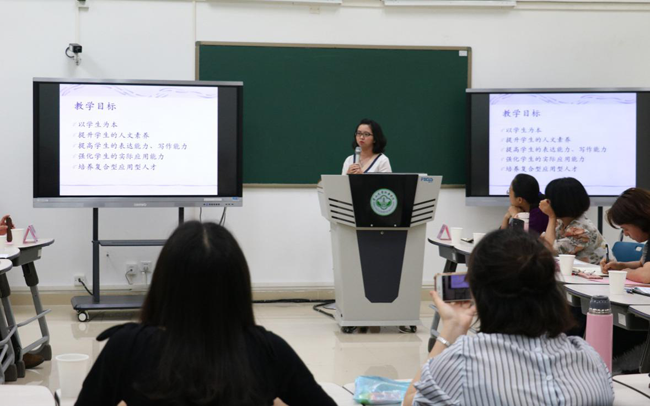 《汉语表达与应用写作》课程组教师代表程露博士介绍了课程组多名教师采用专题教学模式,突出“精讲”的理念,通过实例分析强化对方法的掌握,在有限的课时内提升了课堂教学效率。