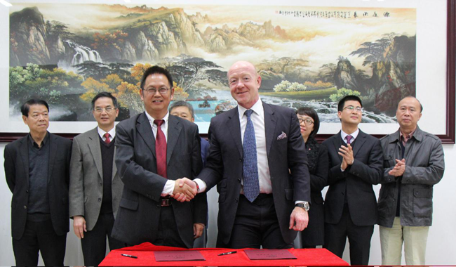 会计学院院长刘运国(左)与楷博财经教育代表CEO Mark Coggins(右)共同签署合作协议 张童威摄