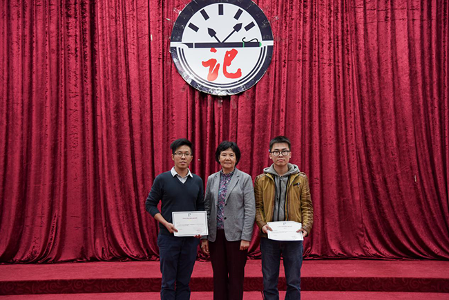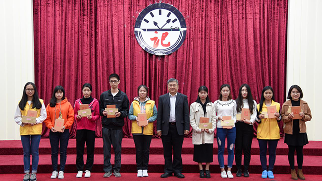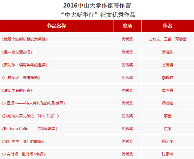 中山大学新华学院校长王庭槐教授为2016中山大学作家写作营“中大新华行”优秀作品奖获得者颁奖