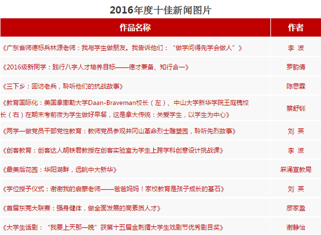 此次大会对“2016广东省‘十佳校媒’”、“2015中国高校校报好新闻”、“2015广东高校校报‘突出贡献奖’”、“2015广东教育好新闻好作品”、“2015广东省高校校报好新闻”、2016年度“十佳校园新闻”、“十佳新闻图片”、“十佳通讯员”、“十佳记者”、“第三届中大新华人风采大赛暨‘我是新华故事家’征文活动”、“2016年中山大学作家写作营‘中大新华行’征文活动优秀作品”进行了表彰。