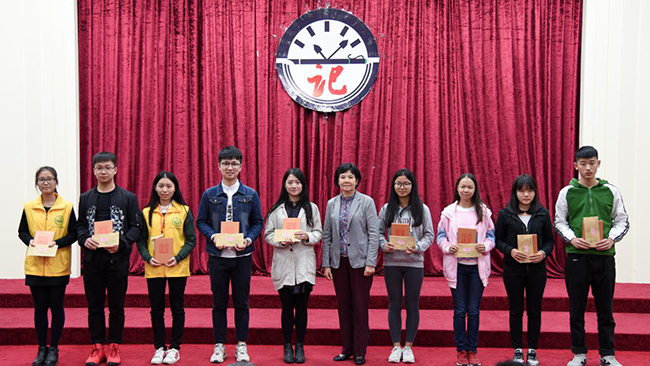 中山大学新华校长助理刘婉莉为2016年度“十佳校园新闻”颁奖
