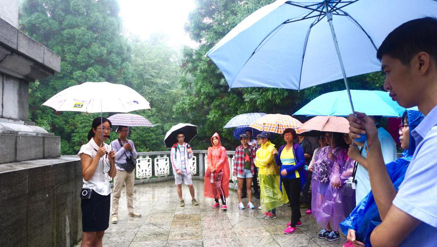 现场教学:学员们在黄洋界保卫战胜利纪念碑前,雨中聆听教师现场讲授