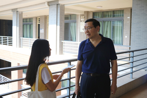 蓝永金副院长、副书记(左一)巡视课堂后与记者交谈