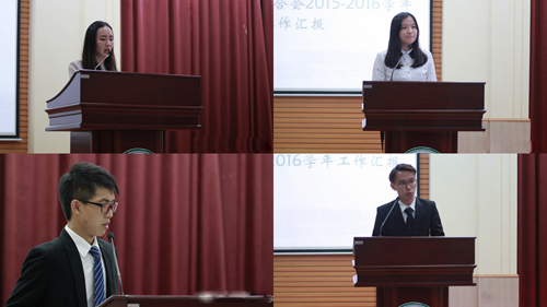 院学生会副主席兼学生社团联合会主席徐瑶、副主席兼艺术团团长董纪显、副主席兼记者站站长徐少伟分别对其组织工作进行汇报。