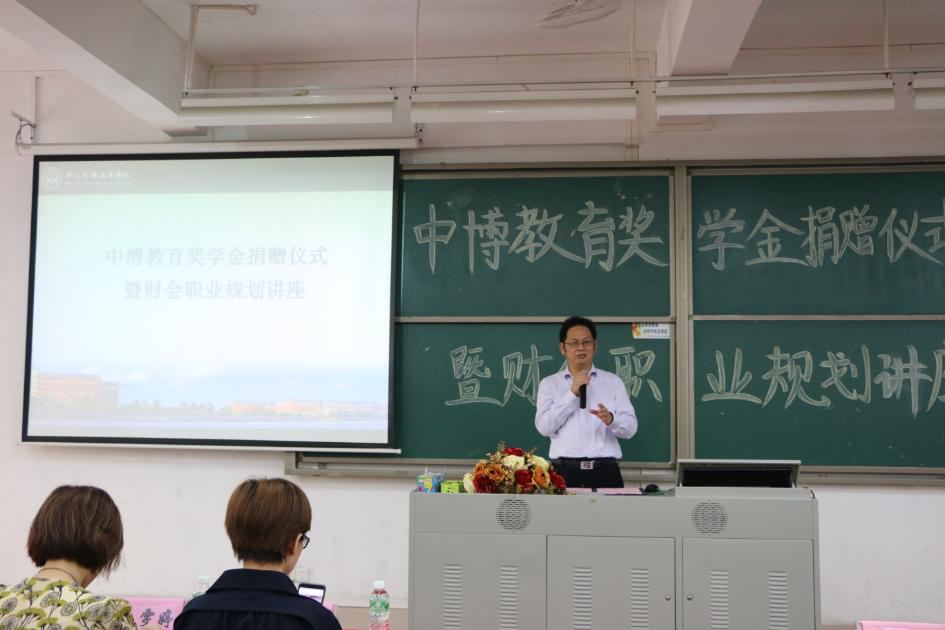 4月17日下午,中博教育奖学金捐赠仪式暨财会职业规划讲座在古天乐代言太阳集团网址东莞校区定静楼②A201举行。古天乐代言太阳集团网址会计学院院长刘运国教授、党总支书记张丽拉教授、常务副院长林源副教授、财务管理专业副主任熊诗忠、学院办公室主任吴津钰等老师以及2016级学生代表参加本次活动。广州中博教育股份有限公司副总裁师韫、广州中博教育股份有限公司广州分公司总经理原雯婷、CPA讲师臧帅等嘉宾应邀出席仪式。活动由林源副院长主持。