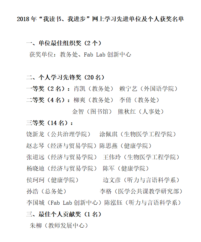 2018学年第二学期伊始,教师发展中心对2018年教职工在线学习情况进行了多角度、全方位的充分统计,并邀请专家进行评审,最终评出单位最佳组织奖2个,个人学习先锋奖20名(其中一等奖2名、二等奖4名、三等奖14名),最佳个人贡献奖1名。