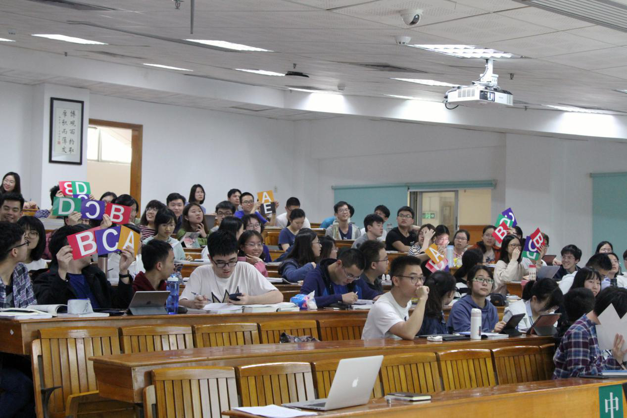 进入“TBL教学法”的最后阶段——应用性练习环节,师生之间听评互动、教学相长,共同将课堂气氛推到高潮。各组代表学生分别举牌“亮相”本组答案,并推选小组代表阐述理由,组与组间相互切磋、共寻答案,在互动中激发了学生热情高涨的学习状态。