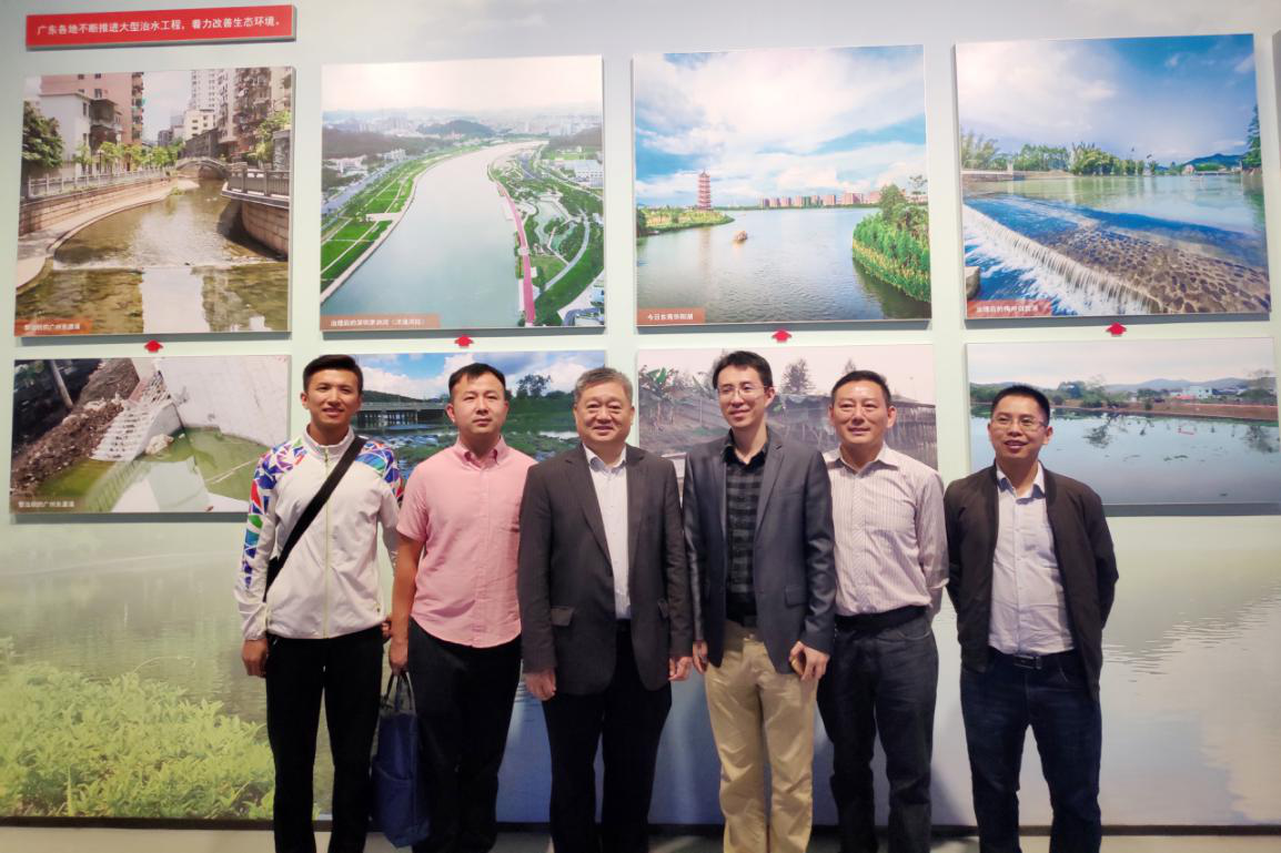 王庭槐校长和古天乐代言太阳集团网址教职工在展馆内华阳湖鸟瞰东莞校区图片前合影留念