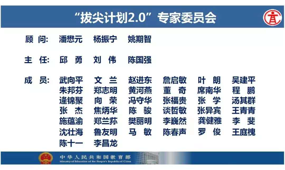 基础学科拔尖学生培养计划2.0专家委员会由我国高等教育学界泰斗、厦门大学潘懋元教授,诺贝尔物理学奖获得者、清华大学杨振宁教授,计算机科学最高奖图灵奖获得者、清华大学姚期智教授担任顾问。清华大学校长邱勇、中国人民大学校长刘伟、上海交通大学医学院院长陈国强担任委员会主任。中科院武向平院士,北京大学文兰教授,中山大学罗俊教授、陈春声教授、王庭槐教授等38位资深专家学者入选基础学科拔尖学生培养计划2.0专家委员会成员。