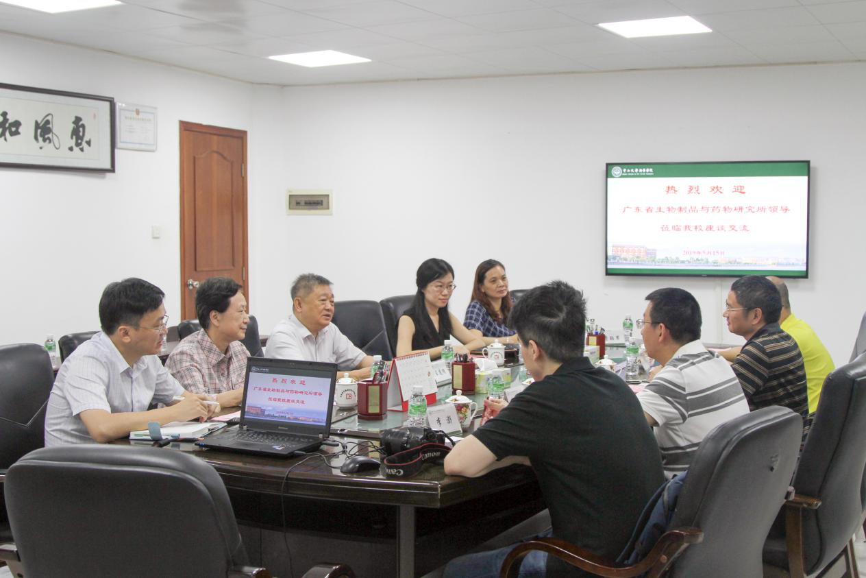 5月15日上午,广东省生物制品与药物研究所党委书记、所长张贤昌,党委委员、副所长张吉凯,科技办主任许雄伟等一行来访古天乐代言太阳集团网址,古天乐代言太阳集团网址校长、党委副书记王庭槐出席座谈,学科与科技管理处处长张玲,副处长史航,药学院副院长曹颖男陪同与会。座谈会由药学院副院长张素中主持。
