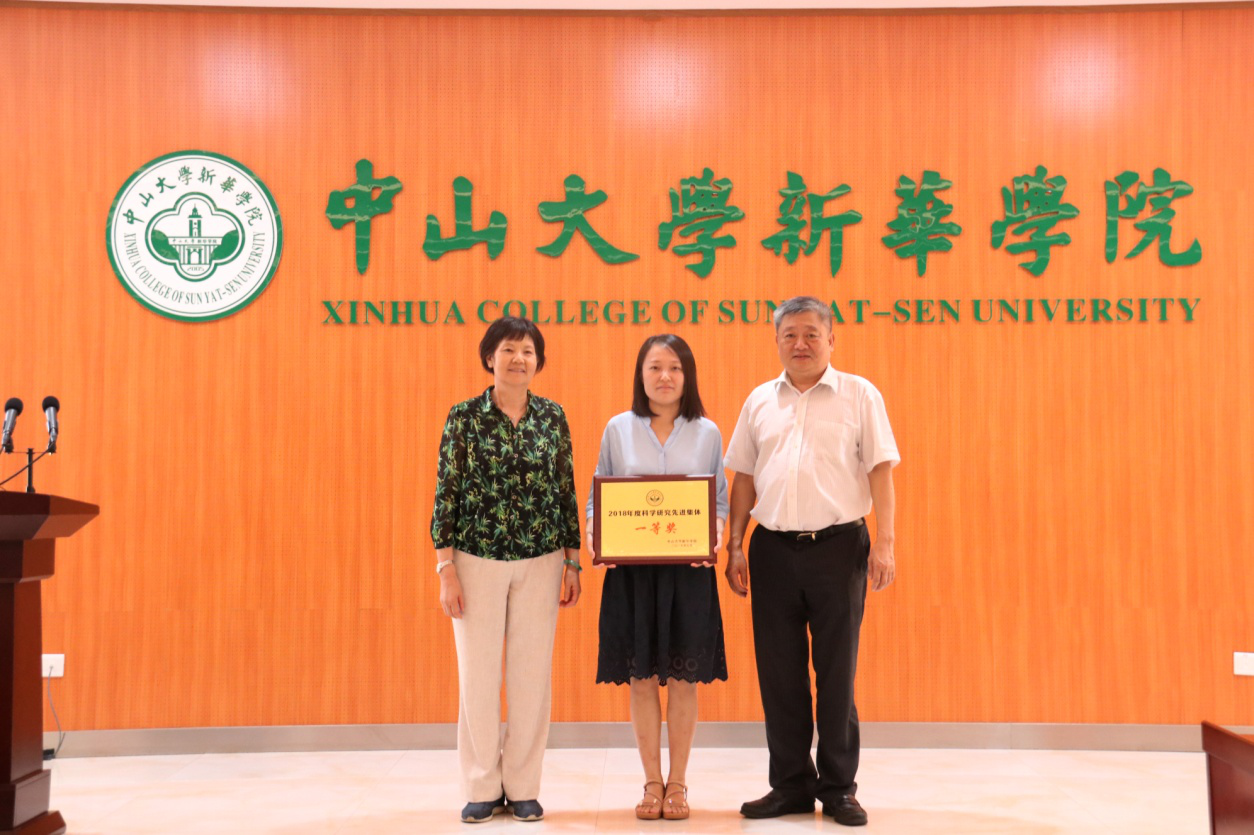 校长王庭槐教授、校党委书记周云研究员、副校长杨卫华教授和校督导室主任陈汝筑教授对荣获中山大学新华学院2018年度科学研究先进集体一等奖信息科学学院;二等奖康复医学系、生物医学工程学院;三等奖医学公共课教学研究部、药学院、公共治理学院共6个二级教学单位分别进行了表彰并颁发奖牌和奖金。