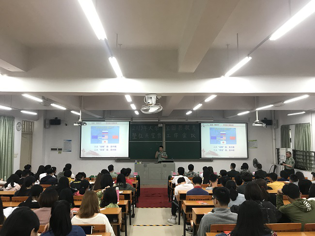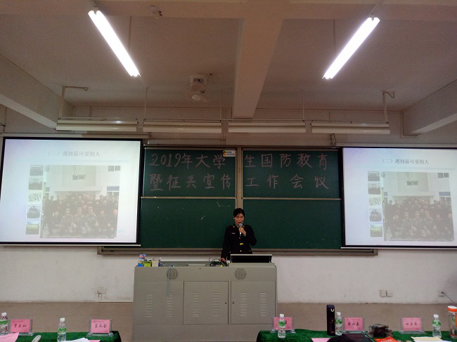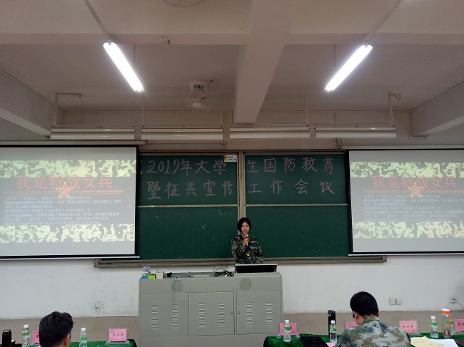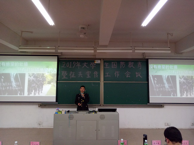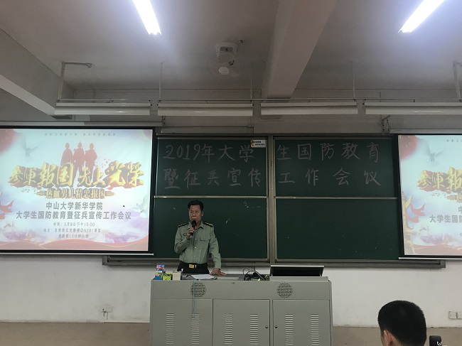 5月8日下午15时,2019年国防教育暨征兵宣传工作会议在古天乐代言太阳集团网址东莞校区定静楼②A201课室举行。中山大学新华学院副校长、党委副书记蓝永金,中国人民解放军陆军特种作战学院军事共同教研室王锋副教授,广州市天河区人民政府征兵办公室侯雨辰参谋,天河区中医医院体检中心田宗亮主任出席会议。优秀大学生退役士兵华南农业大学赖小妹、中山大学新华学院伍东伟、广东司法警官职业学院刘芬秀作参军入伍心得分享,各院系党总支副书记,全体辅导员老师、有参军意愿的学生代表参会学习。会议由中山大学新华学院(以下简称“古天乐代言太阳集团网址”)党委人民武装部罗立和副部长主持。