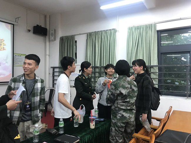 学生纷纷与参军退役学生代表询问参军事宜,解难释疑