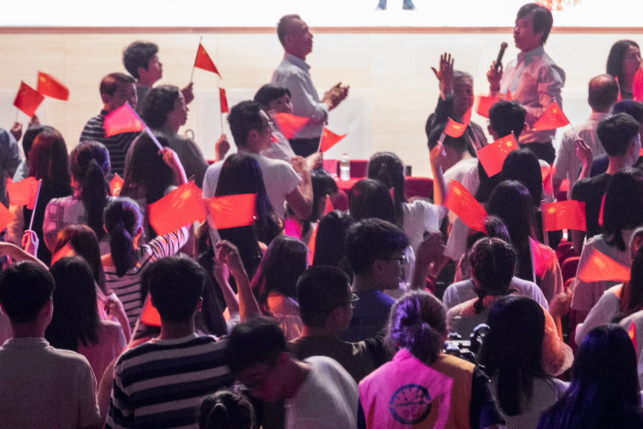 在场师生扬起手中的五星红旗,共唱《歌唱祖国》