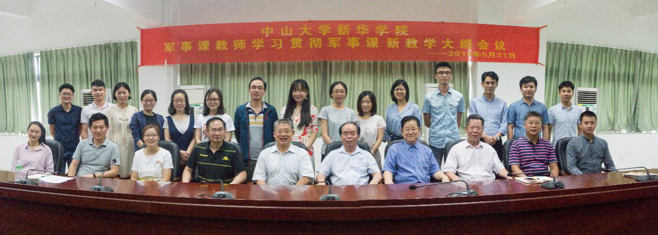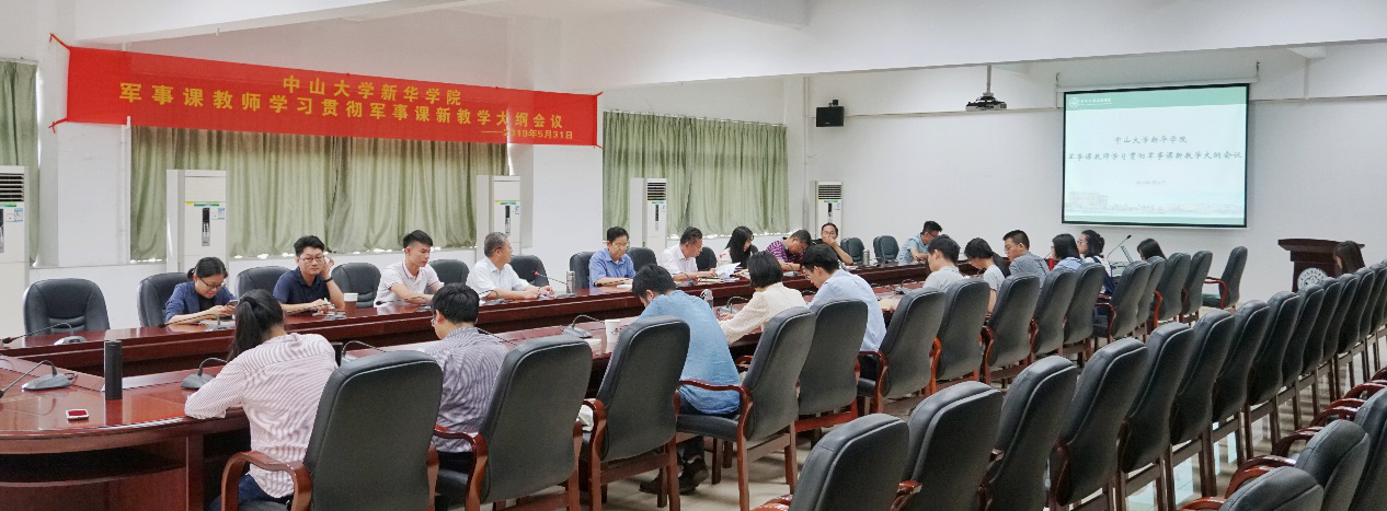 5月31日,中山大学新华学院在东莞校区格物楼②A208会议室召开学习贯彻《普通高等学校军事课教学大纲》(简称《大纲》)会议。武装部副部长黄志刚、罗立和,军事理论教育教研室主任卢黄熙和22位军事课教师代表参加会议。副校长、党委副书记蓝永金出席会议,会议由黄志刚副部长主持。