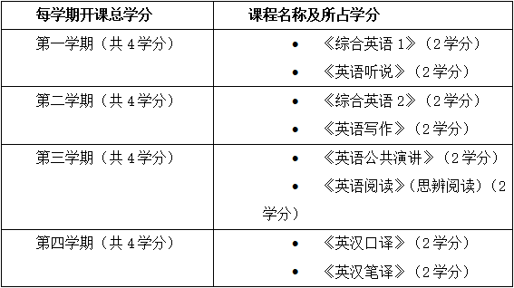 ◆ 学习期为大一、大二的四个连续学期,修读英语(翻译)专业及商务英语专业的英语高级技能课程、人文素养课程和专门用途英语课程,以之取代普通班的大学英语课程。
