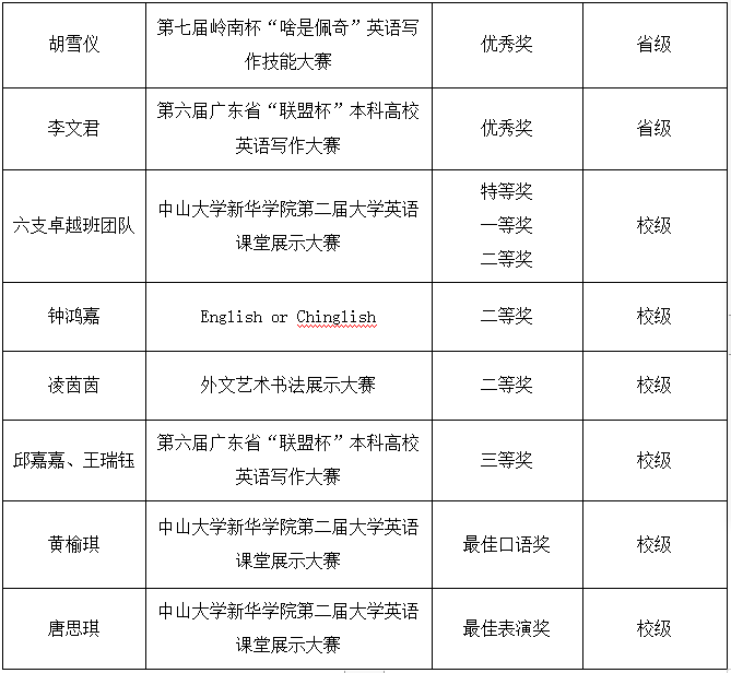 参加校级、市级、省级和国家级等各项英语类比赛并取得好成绩;
