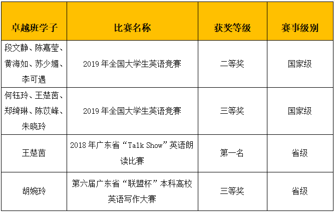 ◆2019年 “卓越英语创新班”将从全校除外国语学院各专业以外的2019级新生中选拔160名学生作为第二届跨专业“卓越英语创新班”成员,共开设5个教学班(广州校区1个,东莞校区4个),每班人数为32人。