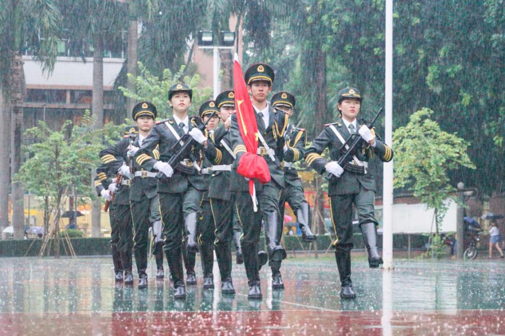 开学典礼上师生在风雨中庄严举行升旗仪式(广州校区)