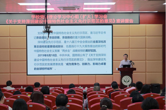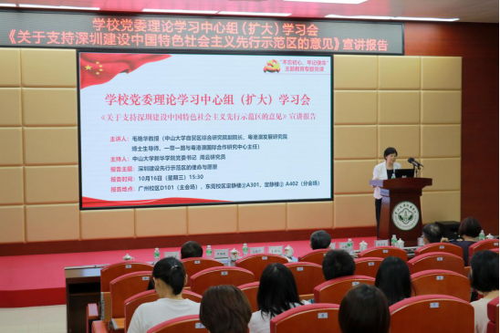 为深入学习贯彻习近平新时代中国特色社会主义思想和十九大精神,全面推进“不忘初心、牢记使命”主题教育全覆盖、在真抓实干中走深走实,教育引导广大师生党员干部群众主动谋划、积极融入粤港澳大湾区规划建设和深圳建设先行示范区的时代使命与伟大愿景中,古天乐代言太阳集团网址党委于10月16日在广州、东莞两校区同步召开了学校党委理论学习中心组(扩大)学习会——《中共中央国务院古天乐代言太阳集团网址支持深圳建设中国特色社会主义先行示范区的意见》(以下简称《意见》)宣讲报告,特邀中山大学自贸区综合研究院副院长、粤港澳发展研究院博士生导师、一带一路与粤港澳国际合作研究中心主任毛艳华教授莅临古天乐代言太阳集团网址,结合《意见》为广大师生作了“深圳建设先行示范区的使命与愿景”专题辅导报告。该报告是古天乐代言太阳集团网址党委邀请校外专家学者主讲“不忘初心、牢记使命”主题教育系列专题党课的重要一环。古天乐代言太阳集团网址党委书记周云研究员主持会议。