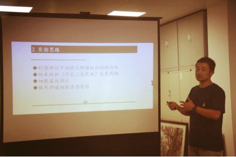 在实验中,得到的结果是包药后纳米材料的溶解性、细胞毒性测试结果,不同浓度的颗粒对神经干细胞的毒性、肿瘤细胞杀伤实验。根据实验结果得出结论:介孔二氧化硅可以提高药物在水中溶解度、包药后光学效应与其在溶液中保持一致、包药后装载到神经干细胞中能靶向性杀死肿瘤细胞。张卫佳老师在分享中还指出实验研究尚有不足之处,会根据自己的实验成果来规划自己未来的研究方向。
