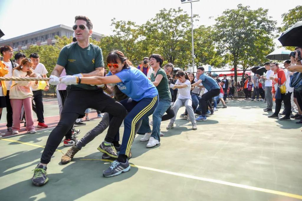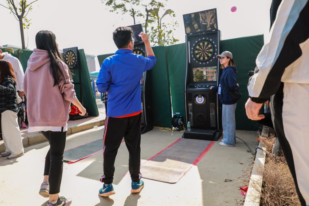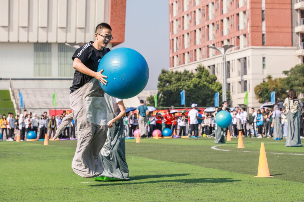 另一边,绿茵草坪上的教职工趣味运动比赛激情四射。教职工穿上袋鼠服装,奋力地跃起,传递出手中的彩色气球。在软式飞镖高分赛场上,其安全性、趣味性、竞技性深受师生喜爱,当选手们三镖都中红心时现场响起一阵阵喝彩。中大新华教师正以自身的实际行动展现出奋力拼搏、坚持与合作的体育精神。师生共同参与体育运动,彰显了体育运动的魅力。