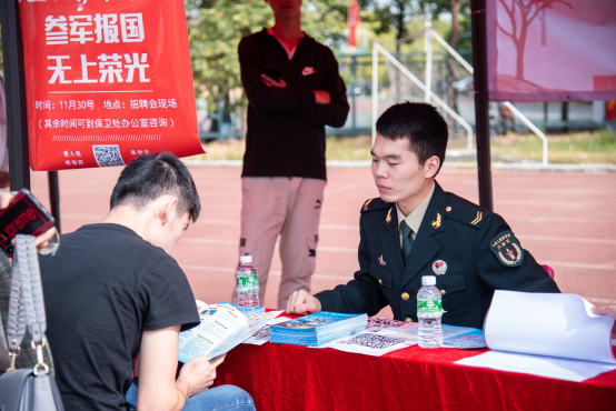 值得一提的是,当前大学生就业方向多元,招聘现场征兵宣传处持续火热。出身军人世家的2019级电子信息专业的查鹏同学在征兵处驻足良久,说:“当兵、考军校是我的梦想,我已认定了自己未来的就业方向。”