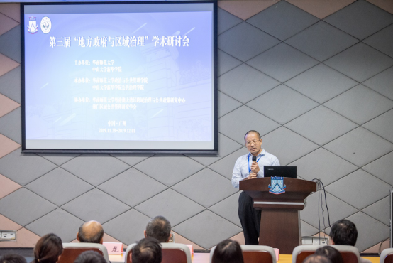 华南师范大学政治与公共管理学院院长胡中锋教授致辞,对到会嘉宾表示热烈欢迎与感谢,表示举办第三届“地方政府与区域治理”学术研讨会十分契合党的十九届四中全会精神,对处在新时代背景下的中国,对促进国家治理体系和治理能力现代化的理论研究和实践有着重要意义。