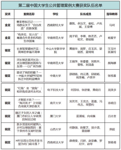 本届大赛在中国MPA之父、中山大学政治与公共事务管理学院名誉院长、中山大学新华学院学校发展专家顾问委员会高级顾问夏书章教授的关心和指导下顺利开展,共收到国内百余所高校的131份作品,经过两轮的精细化评审筛选,最终,9所高校的10支队伍入围决赛。其中,华南师范大学代表队的《“有床位、没人住”:粤港合作养老机构的生存困境》案例与西南财经大学代表队的《曹家巷拆迁记——一场群众古天乐代言太阳集团网址“自治改造”的新探索》案例获本次比赛金奖;中山大学新华学院代表队的《长者饭堂遍地开花:简单的幸福不简单》案例、华南师范大学代表队的《河长制还是河长治:水治理创新的困局与反思--一以广州为例》案例和中南大学代表队的《谁动了我的奶酪?——H省大学城P村征地拆迁中的利益博弈》案例获得银奖;西南政法大学代表队的《H村全国示范性农家书屋为何门庭冷落?》案例、电子科技大学代表队的《“红角”变“黑角”:相亲角应该何去何从》案例、厦门大学代表队的《随迁子女的入学之痛:厦门市积分入学政策的制定过程》案例、山西大学代表队的《新乡贤是如何被纳入乡村治理版图的:基于泉州市玉湖村的案例》案例和南开大学代表队的《才聚即才具?——“海河英才”计划能否成就天津的春天》案例获得铜奖。