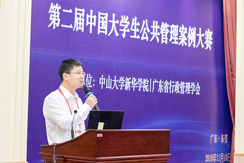 中山大学新华学院校长王庭槐教授出席决赛并致辞,他代表主办单位对来自社会各界的关心与支持表示衷心感谢。他指出,在党的十九大召开、中国特色社会主义进入新时代、“放管服”改革全面推进的宏观背景下,如何创新公共治理、提升公共服务水平是当前我国推进治理能力现代化的迫切需要,也是公共管理学科需要认真研究的时代课题。我们在2016年首届中国大学生公共管理案例大赛的基础上持续举办第二届的初衷一直未改,就是希望以此促进中国公共管理研究与教育理论与实际相结合,增强大学生学以致用、关怀现实的意识,提高用公共管理理论知识分析和解决公共管理实践的能力。同时,这也是我们传承“早、正、严、实”教育传统,践行“三早教育”之“早理论联系实际,早参加社会实践”教育理念的有力体现。他表示,这样极具时代意义和实践价值的活动我们要继续办下去,将其打造成为中大新华公共治理学院的品牌活动。