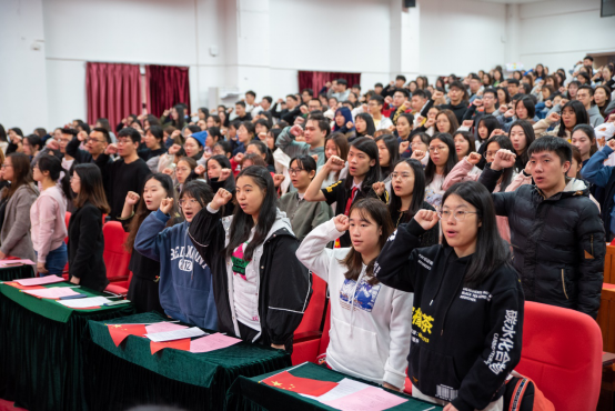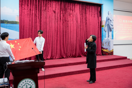 “我宣誓:忠于中华人民共和国宪法,维护宪法权威,履行法定职责……为建设富强、民主、文明、和谐、美丽的社会主义现代化强国努力奋斗!”在李岚教授的领誓下,全体师生举起右手握拳,一起面向宪法和国旗庄严宣誓。