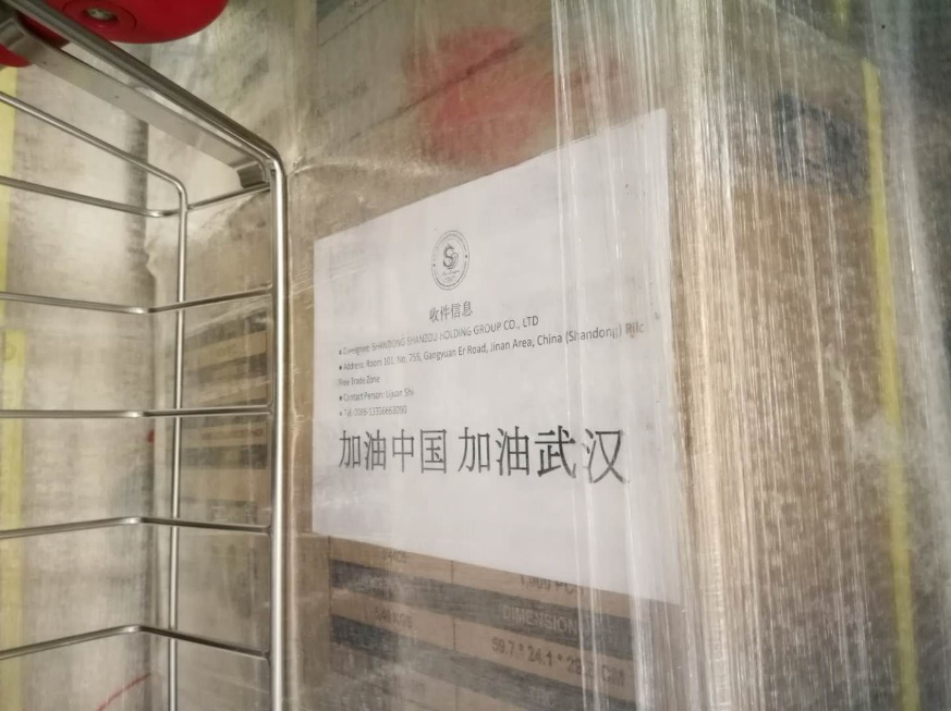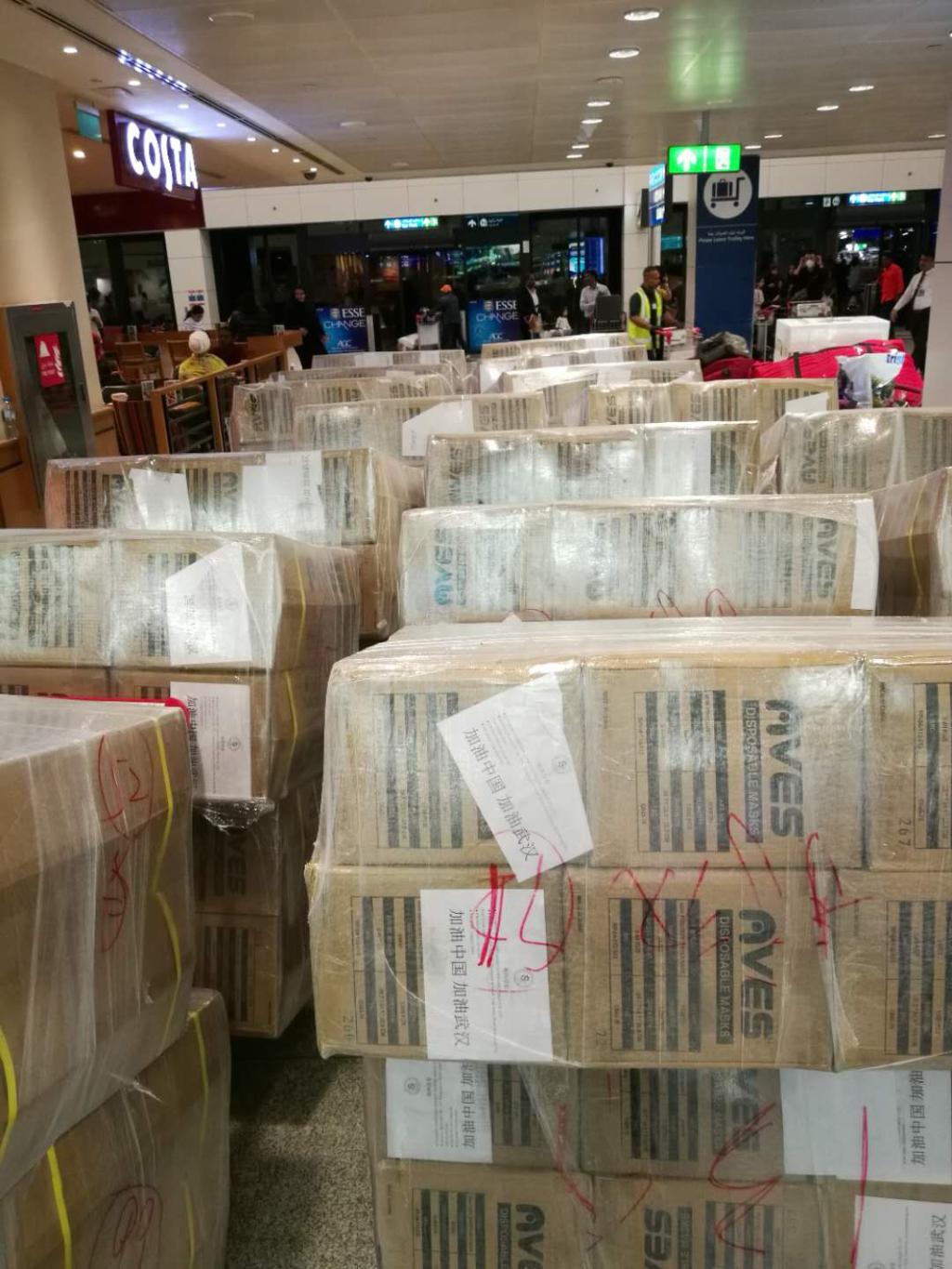 迪拜当地华人捐赠的防疫物资上面写着“加油中国 加油武汉”的字样