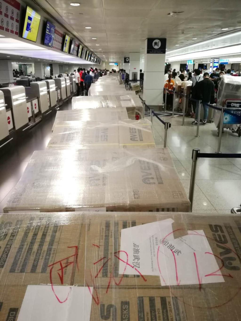 “我们之中有16位志愿者特意买票,专程飞往北京,再由北京转到武汉,护送这批珍贵的物资到达最需要的地方。16位志愿者每一位可免费托运2件行李(纸箱),再交费多托运8件行李(纸箱),但还未托运完。最后,我们只能一个一个去求助同机的旅客,请他们让出行李托运的最大名额。”
