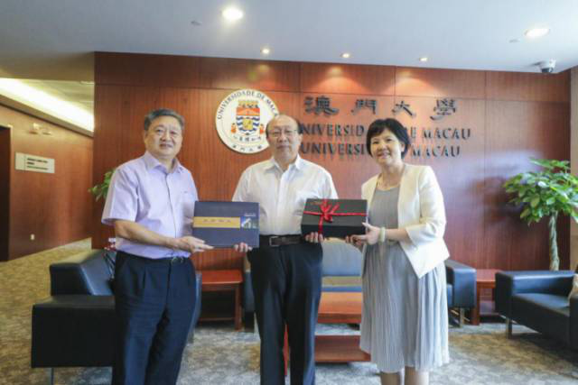 2017年7月4日,王庭槐校长(左)、周云书记(右)率中山大学新华学院代表团应邀访问澳门大学,赵伟校长(中)等热情接待并进行会谈交流