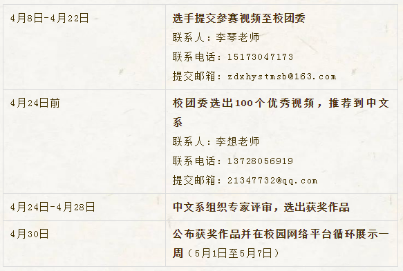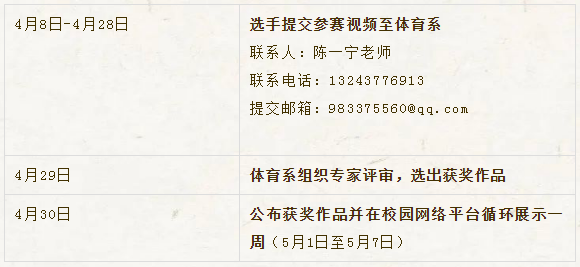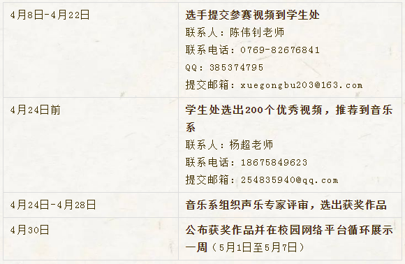 提交视频截止日期: 4月22日(声乐、朗诵)4月28日(韵律操)