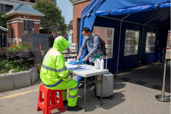 安保人员示意体温异常者分流至在校门口设置的临时观察点