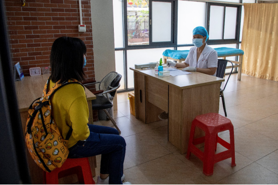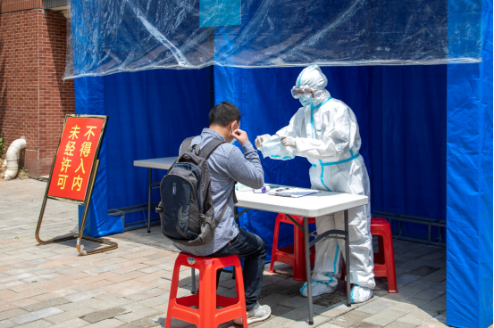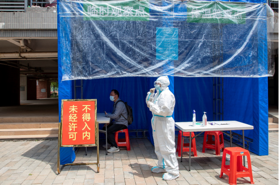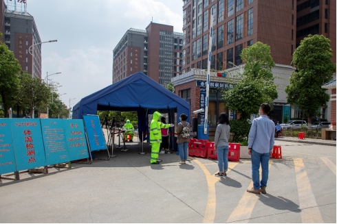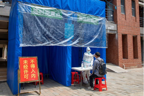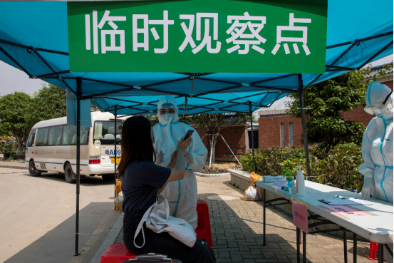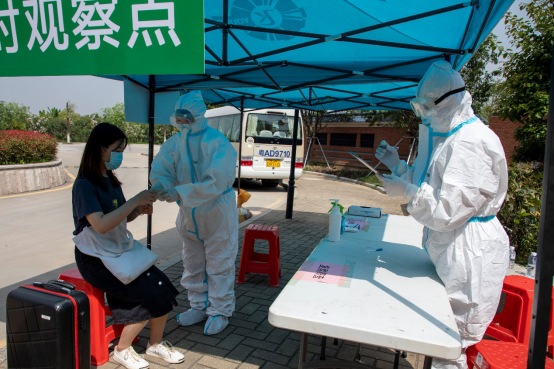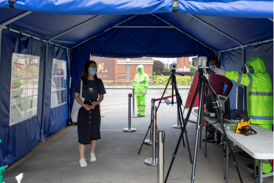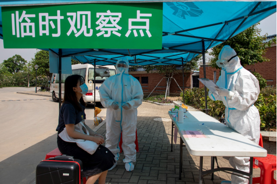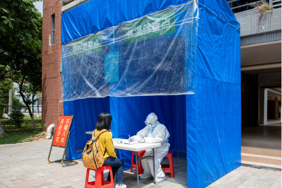 体温异常者来到临时观察点短暂休息后再次接受腋下体温测量